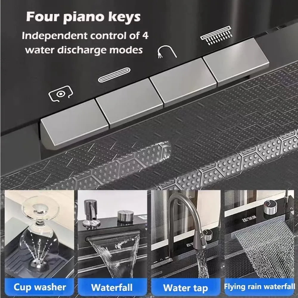 - 【Piano button - 5 water modes】 Pull-out tap, contains 3 water outlet modes plus 2 waterfall modes, large cleaning area, soft and non-splash, you can switch at will according to your needs, greatly improving your work efficiency. Creative piano buttons for independent control of 2 waterfalls, cup washer and pull-out taps and pure water tap.