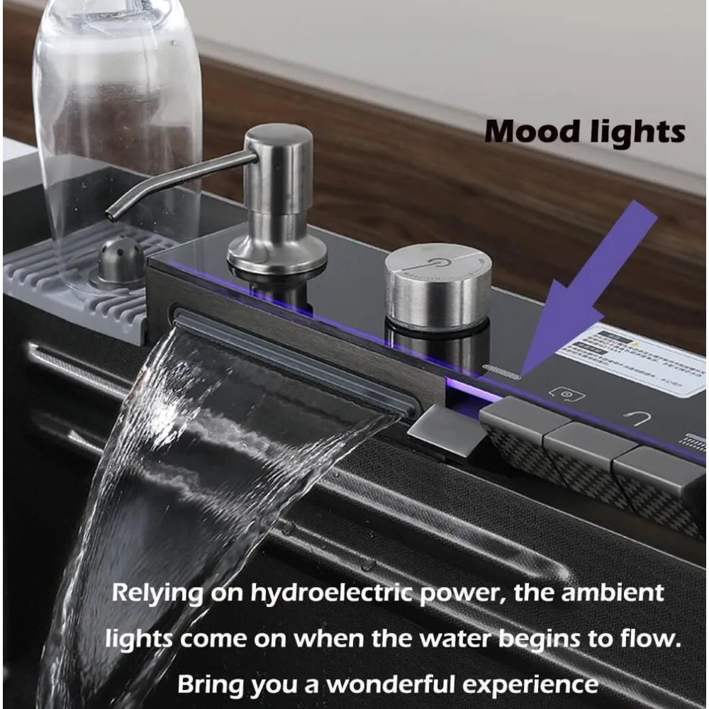 - 【Digital display nano sink】 Stylish grey colour with brushed stainless steel work, it becomes a sight to behold in your kitchen. Double track design, 5 water outlet modes, stainless steel material is wear-resistant and easy to clean. The unique digital screen shows the water temperature and time of use in real time, and when the water starts to flow, the blue mood light comes on to give you a great visual effect, making your kitchen tidier and your life better.